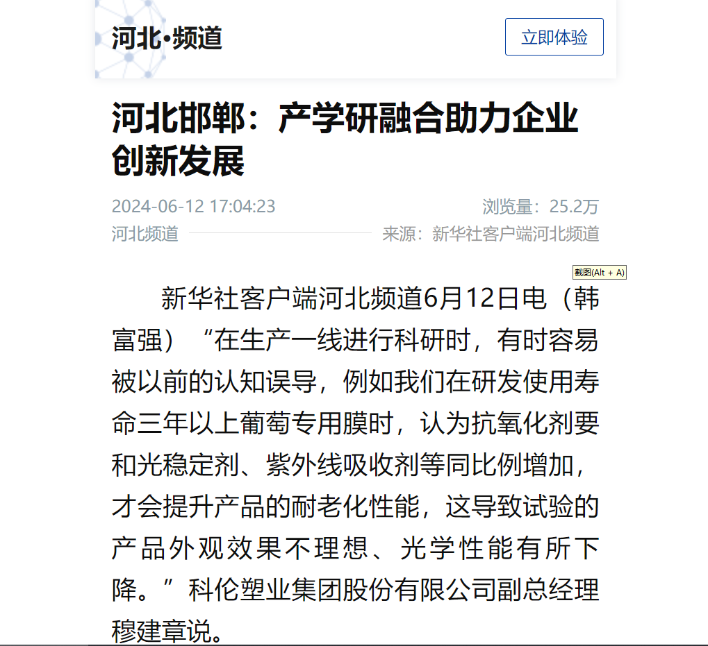 科倫塑業(yè)集團(tuán)股份有限公司于2024年6月12日就公司成長歷程、產(chǎn)學(xué)研融合助力企業(yè)創(chuàng)新發(fā)展方面,公司副總經(jīng)理穆建章接受新華社河北分社采訪,報(bào)道詳情如下